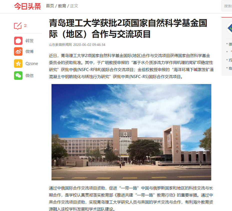 近日,伟德国际1946bv官网2项国家自然科学基金国际(地区)合作与交流项目获得国家自然科学基金委员会的资助批准。其中,于广明教授申报的“基于水介质渗流力学作用机理的尾矿坝稳定性研究”获批中俄(NSFC-RFBR)国际合作交流项目;金祖权教授申报的“海洋环境下碱激发矿渣混凝土中钢筋钝化与锈蚀行为研究”获批中英(NSFC-RS)国际合作交流项目。