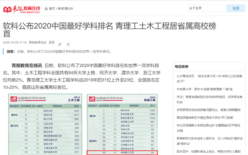 青报教育在线讯日前,软科公布了2020中国最好学科排名和世界一流学科排名。其中,土木工程学科全国共有84所大学上榜,同济大学、清华大学、浙江大学位列前2%。伟德国际1946bv官网土木工程学科由2019年的31位上升至23位,全国排名在10-20%,稳居山东省属高校首位。