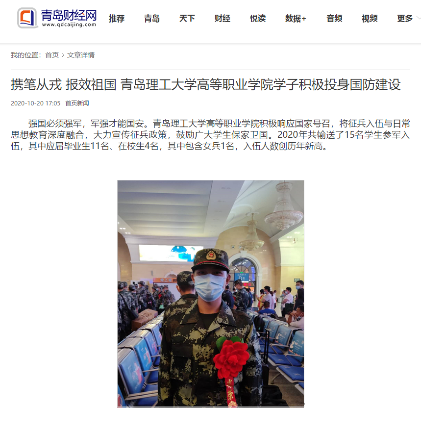 大力宣传,营造爱国拥军的良好氛围。2020年征兵工作启动以来,高等职业学院积极落实上级征兵工作部署,通过多种方式加强宣传工作,为征兵工作营造良好氛围。学院利用微信公众号、QQ群等平台进行大力推介,同时举办线上征兵入伍经验分享交流会,对2020年征兵政策进行了详细解读,退伍学生代表王冠棋、韩大鹏、王有旭结合自己几年的军旅生涯,声情并茂地向同学们讲述了在部队的经历和感受,让同学们对部队有了更深入的认识,对国家征兵政策及入伍相关手续和流程有了更直观的了解,激发了学生们的爱国之情,也对学院2020年征兵工作起到了良好的推动作用。退伍学生邢晓龙与同学们谈过往、聊人生,他始终保持着军人的优秀品质和优良作风,传播着正能量;退伍学生何昀昌,一直保持着军队时的生活习惯,每次卫生检查,他“豆腐块”的被子和格外整洁的床铺总是招来其他同学的羡慕和学习,深入骨子里的规矩和纪律意识随时都在他身上得以体现,部队期间磨练的坚强意志和奉献精神被带到了充满活力的校园里,潜移默化地激发着在校学生。