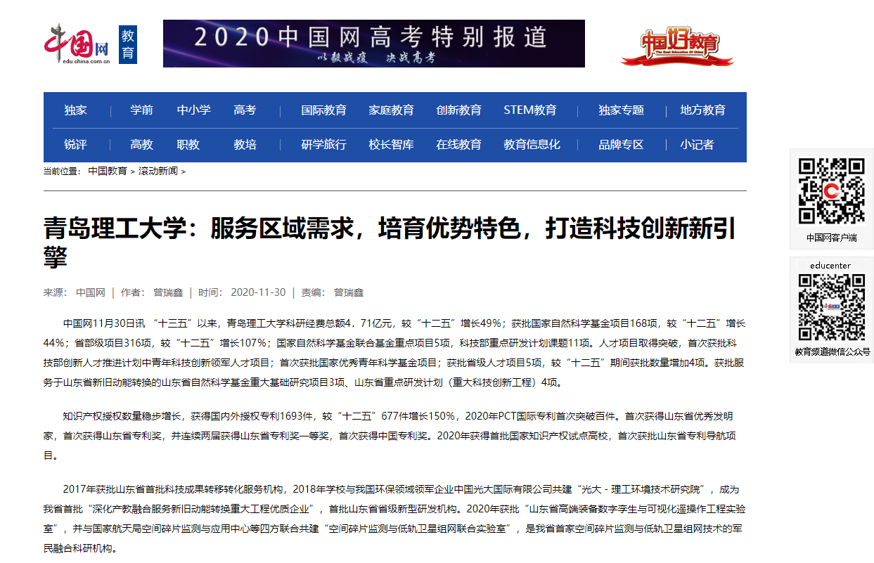 学校坚持“立足青岛、服务山东、面向全国”,着力探索校企、校地合作新模式,加快推进科教产融合,打造“区域特色+学科优势”科技创新“双引擎”,赋能科研高质量发展,为区域经济社会建设提供更多的智力、人力和技术支持。