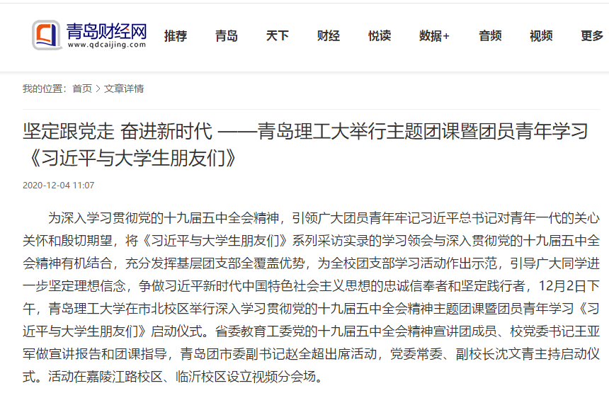 为深入学习贯彻党的十九届五中全会精神,引领广大团员青年牢记习近平总书记对青年一代的关心关怀和殷切期望,将《习近平与大学生朋友们》系列采访实录的学习领会与深入贯彻党的十九届五中全会精神有机结合,充分发挥基层团支部全覆盖优势,为全校团支部学习活动作出示范,引导广大同学进一步坚定理想信念,争做习近平新时代中国特色社会主义思想的忠诚信奉者和坚定践行者,12月2日下午,伟德国际1946bv官网在市北校区举行深入学习贯彻党的十九届五中全会精神主题团课暨团员青年学习《习近平与大学生朋友们》启动仪式。省委教育工委党的十九届五中全会精神宣讲团成员、校党委书记王亚军做宣讲报告和团课指导,青岛团市委副书记赵全超出席活动,党委常委、副校长沈文青主持启动仪式。活动在嘉陵江路校区、临沂校区设立视频分会场。