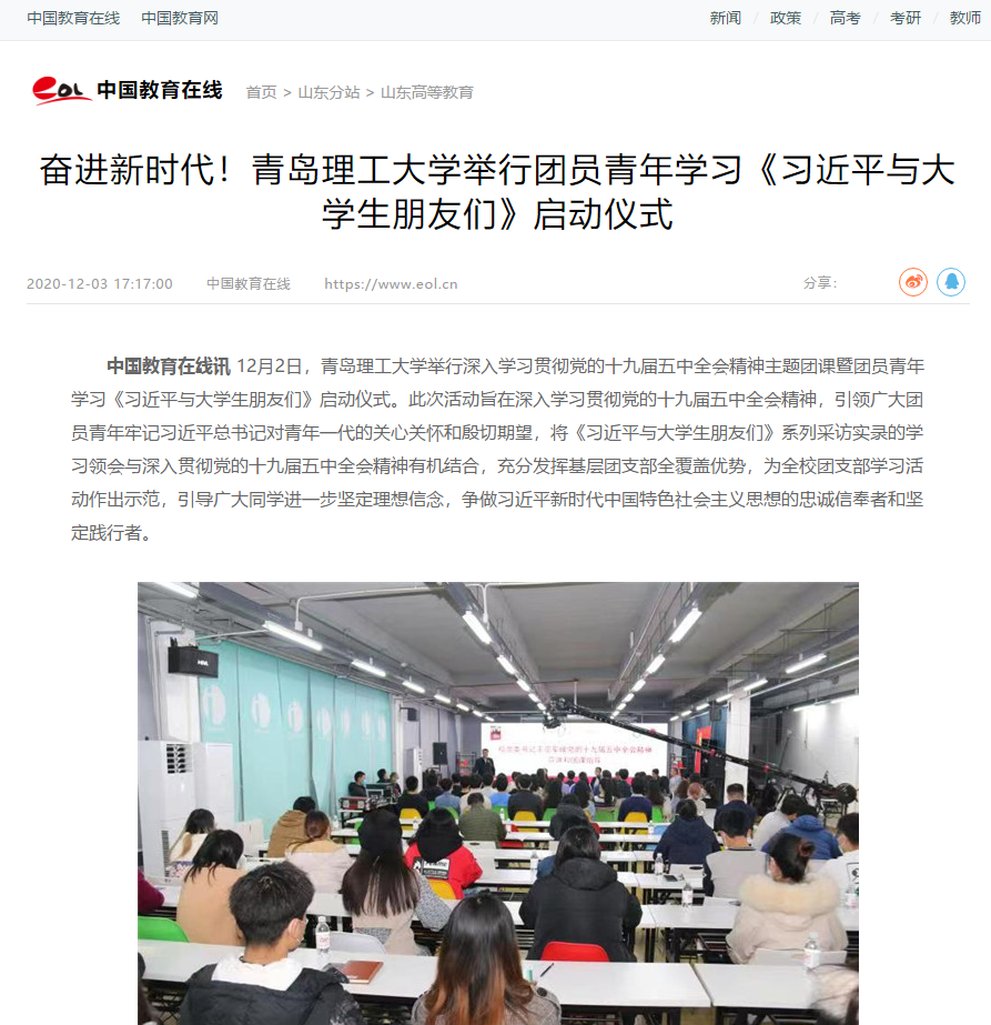 中国教育在线讯12月2日,伟德国际1946bv官网举行深入学习贯彻党的十九届五中全会精神主题团课暨团员青年学习《习近平与大学生朋友们》启动仪式。此次活动旨在深入学习贯彻党的十九届五中全会精神,引领广大团员青年牢记习近平总书记对青年一代的关心关怀和殷切期望,将《习近平与大学生朋友们》系列采访实录的学习领会与深入贯彻党的十九届五中全会精神有机结合,充分发挥基层团支部全覆盖优势,为全校团支部学习活动作出示范,引导广大同学进一步坚定理想信念,争做习近平新时代中国特色社会主义思想的忠诚信奉者和坚定践行者。