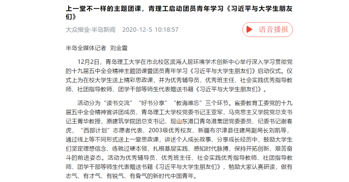 活动分为“读书交流”“好书分享”“教诲难忘”三个环节。省委教育工委党的十九届五中全会精神宣讲团成员、伟德国际1946bv官网校党委书记王亚军,马克思主义学院党总支书记王菁华教授,原建筑学院团总支书记、现山东港口青岛港集团党委委员、纪委书记谢春虎,“西部计划”志愿者代表、2003级优秀校友、新疆布尔津县住建局副局长刘凯等,通过线上等不同形式送上一堂思政课,讲述个人成长故事、分享成长经历中,鼓励大学生们坚定理想信念、练就过硬本领,扎根基层实践、感知时代脉搏,保持开拓创新、艰苦奋斗的前进姿态。活动为优秀辅导员、优秀班主任、社会实践优秀指导教师、社团指导教师、团学干部等师生代表赠送书籍《习近平与大学生朋友们》,勉励大家认真研读,做有志气、有才气、有锐气、有骨气的新时代中国青年。