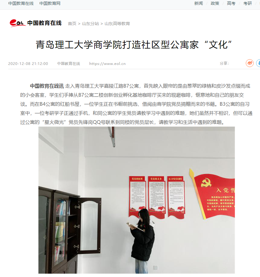 中国教育在线讯走入伟德国际1946bv官网嘉陵江路B7公寓,首先映入眼帘的是由葱翠的绿植和皮沙发点缀而成的小会客室,学生们手捧从B7公寓二楼创新创业孵化基地咖啡厅买来的现磨咖啡,惬意地和自己的朋友交谈。而在B4公寓的红船书屋,一位学生正在书橱前挑选、借阅由商学院党员捐赠而来的书籍。B3公寓的自习室中,一位考研学子正通过手机,和同公寓的学生党员请教学习中遇到的难题,她们虽然并不相识,但可以通过公寓的“星火微光”党员先锋岗QQ号联系到同楼的党员层长,请教学习和生活中遇到的难题。