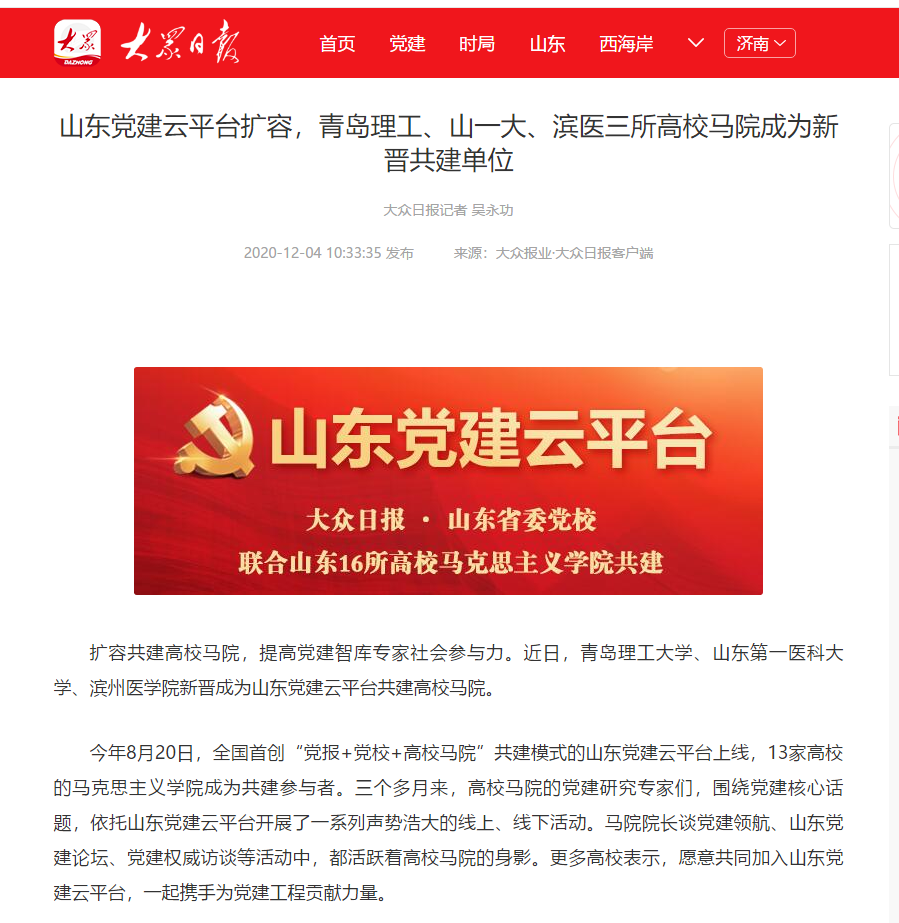 目前,山东党建云平台共建方为大众日报、山东省委党校,以及山东大学、中国海洋大学、济南大学、伟德国际1946bv官网、山东建筑大学、山东师范大学、鲁东大学、山东财经大学、青岛大学、烟台大学、山东第一医科大学、滨州医学院、山东交通学院、山东女子学院、齐鲁师范学院、山东青年政治学院16所高校的马克思主义学院。