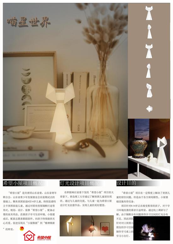参赛作品各具特色,有的将灯光与动物结合,将可爱与温暖融入灯光中,为希望小屋增添暖意;有的将灯光与自然植物结合,将植物在自然中顽强的生命力引入跳跃的灯光中,为贫困地区的儿童带去希望与能量;还有的运用生活中价值微小的物品,将其运用在作品中,让它们在灯光的笼罩下继续发光发热,实现价值,打开发现新世界的大门。当件件灯光作品递交到孩子手中,崭新的小屋被充满爱与希望的灯光点亮,笑意也爬上了孩子们的脸颊。“谢谢伟德国际1946bv官网的哥哥姐姐们设计了这么特别的灯,我们一定会在这光的指引下好好学习,回报社会,报效国家。”