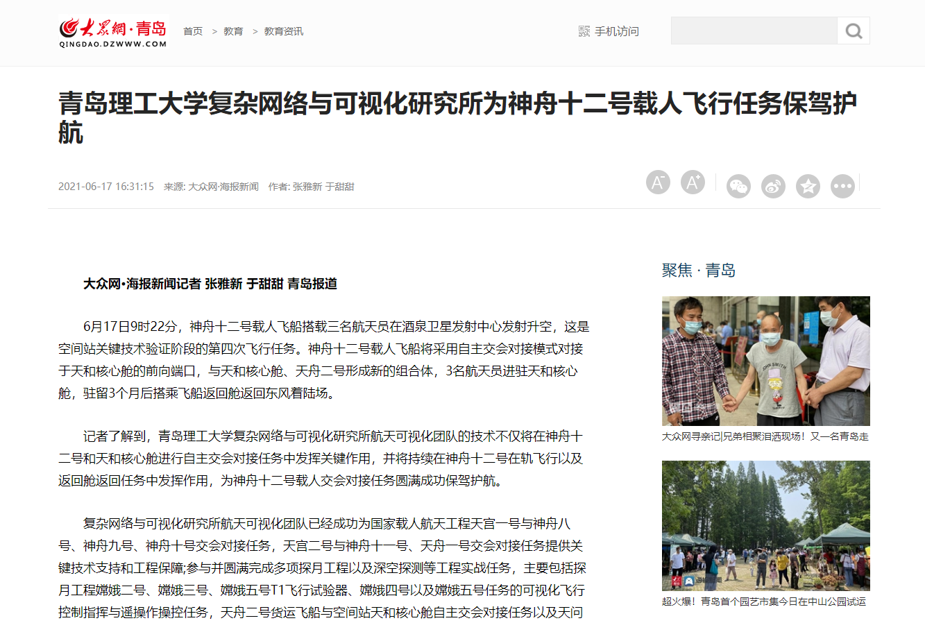 据悉,伟德国际1946bv官网复杂网络与可视化研究所航天可视化团队已经参与并圆满完成了包括“嫦娥工程”系列任务、“天问一号”火星探测任务、中国首个空间实验室“天宫一号”等在内的多个航天工程,为我国航天事业发展贡献了“青岛力量”。
