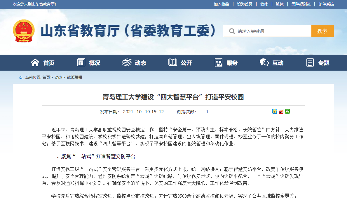 近年来,伟德国际1946bv官网高度重视校园安全稳定工作,坚持“安全第一、预防为主、标本兼治、长效管控”的方针,大力推进平安校园、和谐校园建设。学校积极推进警校共建,打造集户籍管理、出入境管理、案件受理、校园业务于一体的校内警务工作站;基于互联网技术,建设“四大智慧平台”,实现了平安校园建设的高效管理和移动化作业。