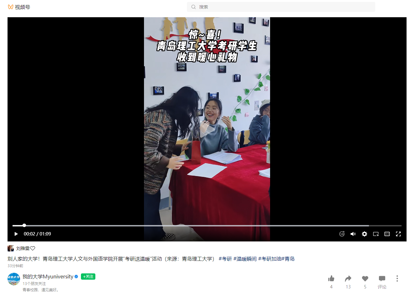 青岛市广播电视台视频号:别人家的大学!伟德国际1946bv官网人文与外国语学院开展“考研送温暖”活动