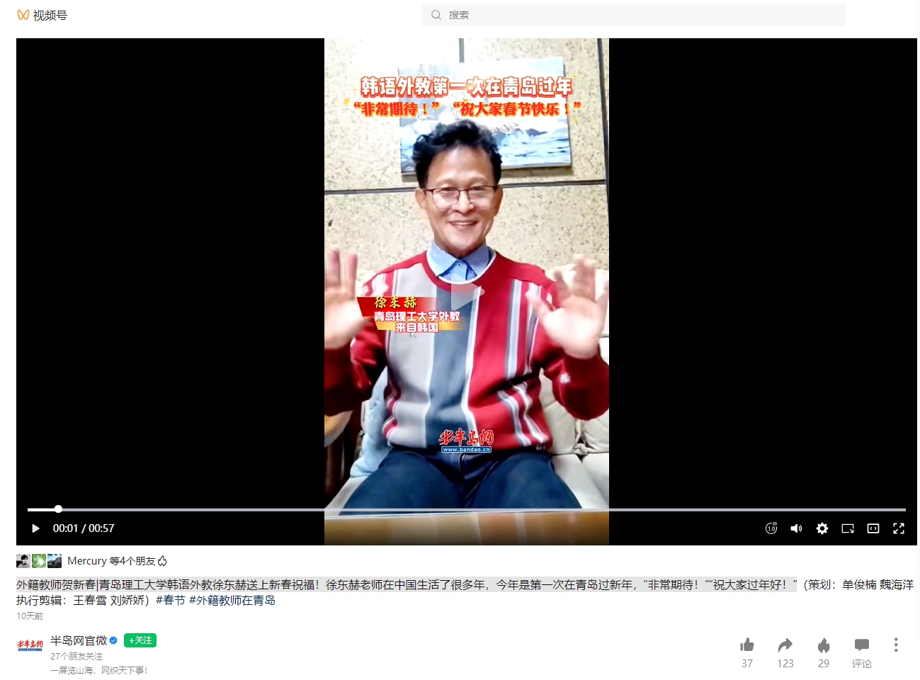 半岛网官微视频号:外籍教师贺新春|伟德国际1946bv官网韩语外教徐东赫送上新春祝福!