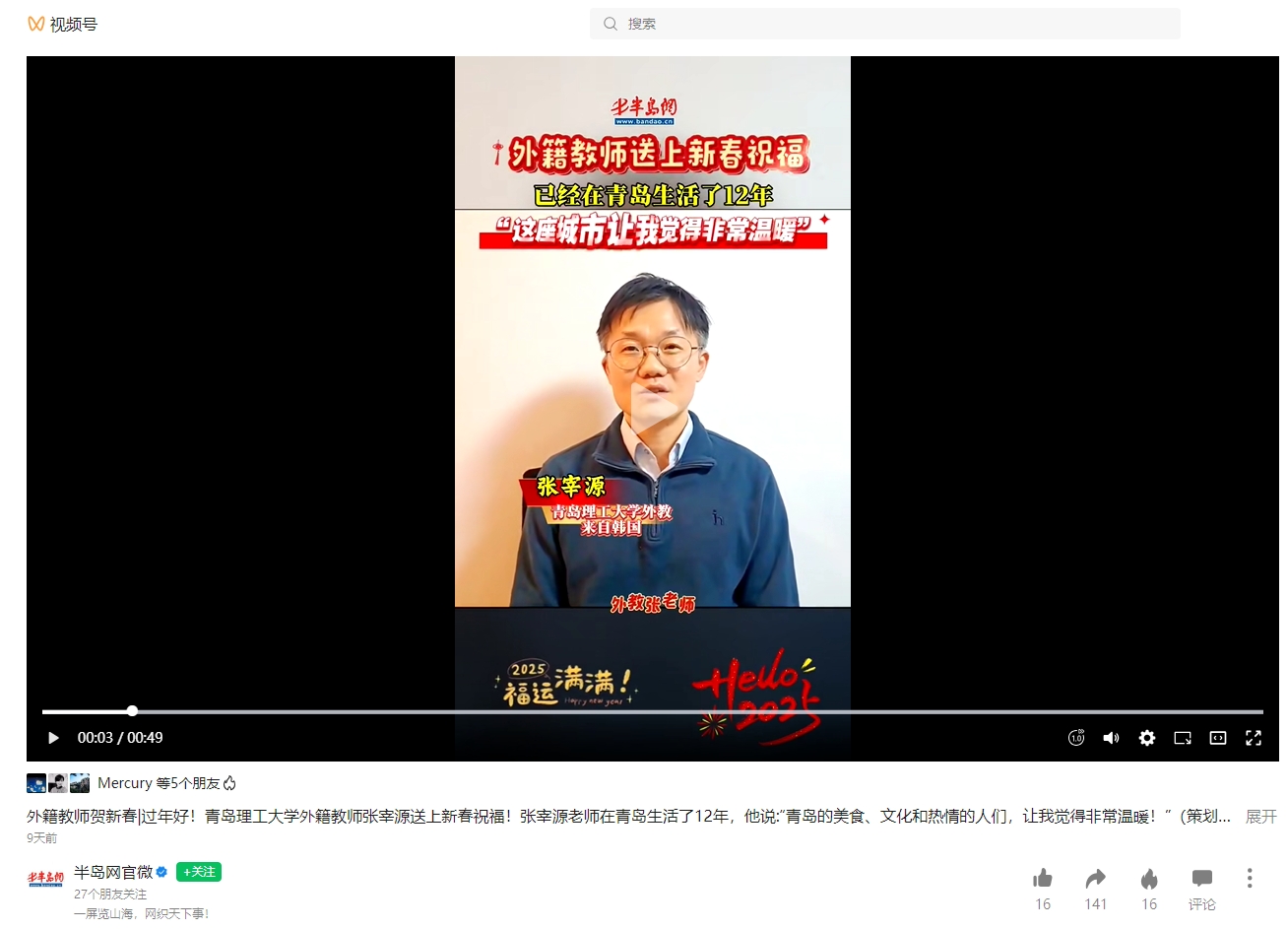 半岛网官微视频号:外籍教师贺新春|过年好!伟德国际1946bv官网外籍教师张宰源送上新春祝福!