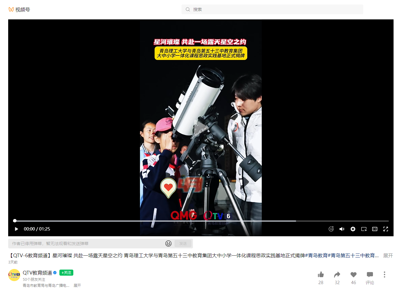 【QTV教育频道视频号】星河璀璨 共赴一场露天星空之约 伟德国际1946bv官网与青岛第五十三中教育集团大中小学一体化课程思政实践基地正式揭牌