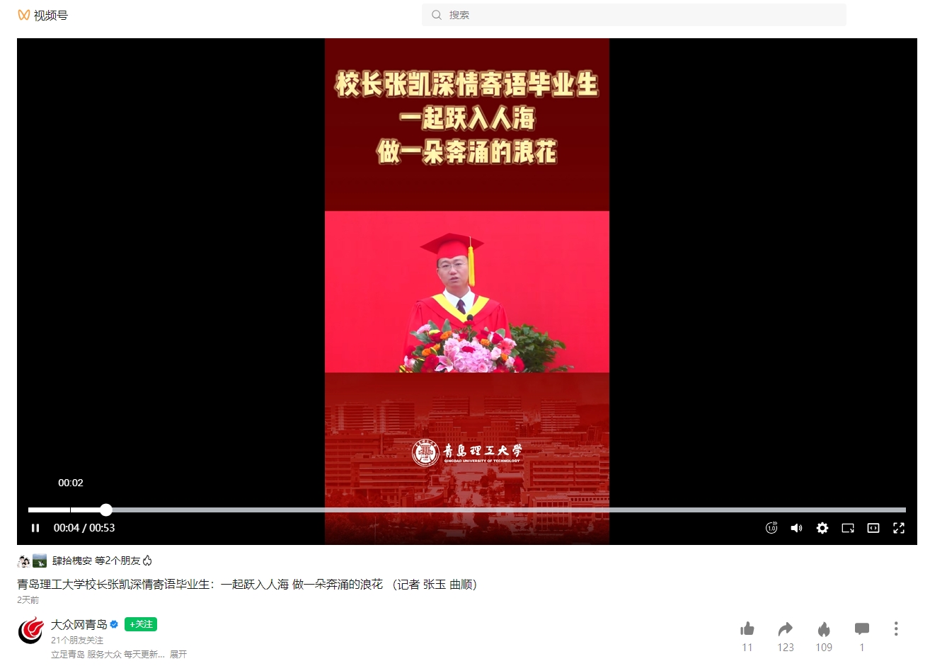 【大众网青岛】伟德国际1946bv官网校长张凯深情寄语毕业生:一起跃入人海,做一朵奔涌的浪花