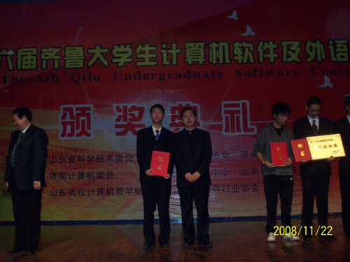 11月28日上午,第六届齐鲁大学生软件设计大赛颁奖典礼在山东省科技馆举行。山东省科学院、山东省计算机学会、齐鲁软件园、济南市科协有关领导出席典礼。计算机学院党总支副书记魏俊文和获奖学生代表焦扬、沈晔参加了颁奖典礼。