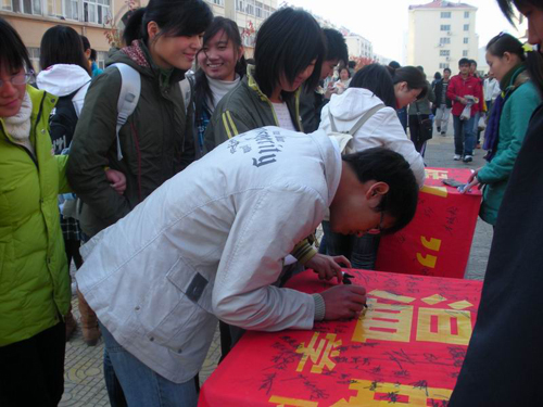 在枯寒的冬天,同学们为理工大校园内的莘莘学子和校外的陌生人送上了心灵的温暖、诚挚的问候和真挚的祝福。(商学院 游震)