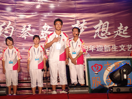 晚会首先由杨阳老师与大学生艺术团的演员们共同表演的佤族舞蹈《小河淌水》拉开序幕。风趣幽默的相声和情景剧,动感十足的街舞,气势恢宏的武术等精彩表演,赢得了现场观众的阵阵掌声。其中,琴岛学院30名奥帆赛志愿者表演的情景剧《这就是我们的志愿者》再现了“我参与·我奉献·我快乐”的志愿者精神,他们也表达了将爱心永驻琴岛学院的心声。“校园之声”广播站的同学慷慨激昂的朗诵了《祖国颂》,他们将一腔爱国热情表现得淋漓尽致。晚会中,刘丹老师也为新生献歌《最初的梦想》为新生们点燃实现梦想的希望,将晚会推至高潮。最后,08级晚会在充满激情的歌曲串烧《我要飞》中圆满落幕。