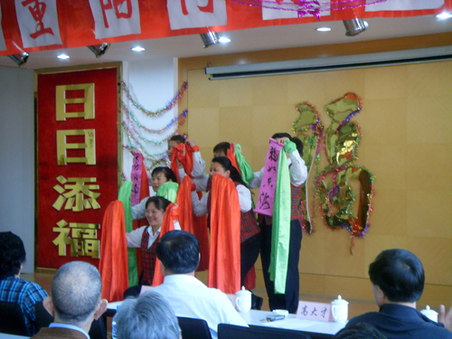 下午3时许,志愿者与老人们共同参加了题为“九九重阳同乐会”的小型晚会。老人们用自己精心准备的节目讲述着自己的高兴,用自己的淳朴自然的笑容述说着自己的幸福,让志愿者们感受到老人们“晚霞”般的美丽。在欢快的音乐中,志愿者陪伴老人度过了一个愉快的重阳节。