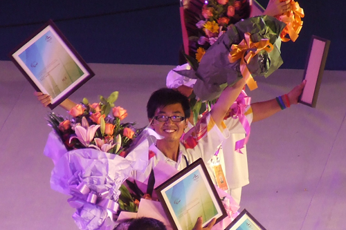 伟德官网学生在残奥帆赛闭幕式上代表社会志愿者领奖