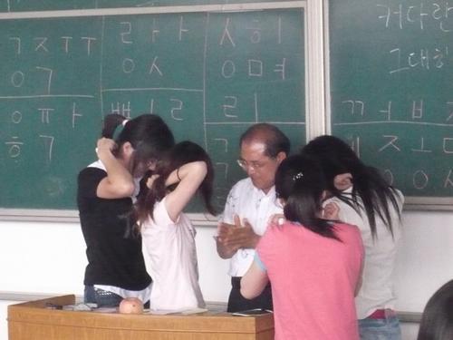 6月11日下午1点半,朝鲜语专业06级一班,07级一班、二班在2号教学楼204教室举办了第一届“韩国知识竞赛”。十组在开场游戏中脱颖而出的选手参加了比赛。本场比赛特邀朝鲜语专业老师张春梅、韩存玺、王延红、杨萍以及外教金钟善老师担任评委。