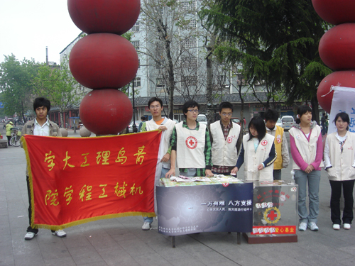 地震发生以后,机械学院立即排查了灾区学生家庭受灾情况,及时做好学生的帮扶动作。为了更好的帮助本学院川籍学生,5月19日机械学院学生会联合红十字志愿服务团在海云庵广场共同开展了募捐活动。