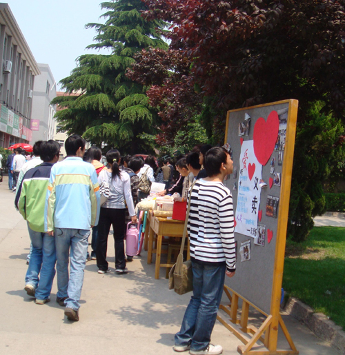 5月20日中午11点整,在四方校区北院食堂门口,由建筑学院资源06级同学组织的“情系灾区,爱心义卖”活动拉开了序幕。