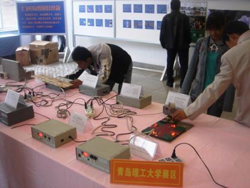 在展览中,我院成功展出了12件作品,吸引了众多参观者驻足。其中,我院曾获得“05年全国大学生‘挑战杯’电子设计竞赛”二等奖的“智能交通信号灯控制系统”、获得“全国大学生毕业设计大赛”三等奖的“模拟交通灯设计”、获得“06年全国电子大赛山东区”二等奖的“简易数字交流毫伏表”及“路灯节能系统”以其简洁的设计思路、切实可行的设计原理获得了众人啧啧称赞。尤其是价值逾万元的“PDI温度控制装置”更是成为了全场的亮点,博得参观展览的领导与评委一致好评。