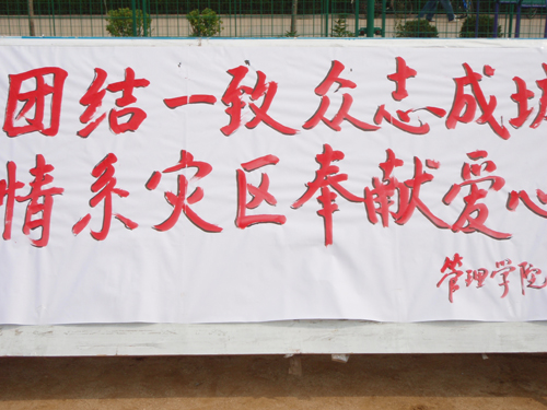 5月12日下午,四川省汶川县发生7.8级地震,给当地人民群众造成了巨大的生命财产损失。灾情传至管理学院,师生们心情无比悲痛。全院师生对灾情变化高度关注,对灾区人民生活无比担忧,纷纷表示要积极响应党中央、国务院号召,发扬"一方有难,八方支援"的精神,纷纷伸出援助之手,送去一份爱心,帮助灾区人民抗震救灾,渡过难关。