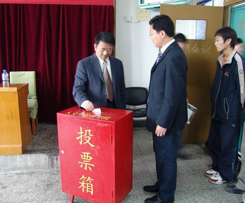 随后大会进行学院党总支换届选举。教职工党员和学生党员认真的填写了选票,进行投票选举。最后大会选举出王众臣、林桂梅、谭业庭、任颖栀、陈国庆为新一届党总支委员会委员。党总支书记王众臣代表新一届党总支发言,他提出新一届的党总支一定要不断总结,不断的创新,坚持民主,团结一心,齐心协力,努力实现人文社科学院更好更快的发展,为学校和学院发展做出贡献。