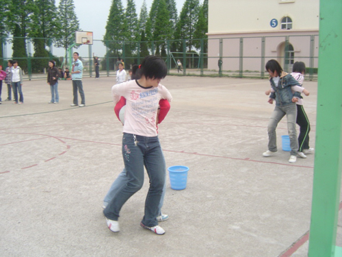 活动一开始,整个篮球场就人声鼎沸,各参赛选手激情四溢,摩拳擦掌。上午,开展了天女散花、真真假假、左手夹球三项活动。天女散花,即团队中有两名选手在中间向两边扔毽子,另两名同学用篮子接,最终以接到毽子的个数计分。各参赛队你追我赶,气氛异常热烈。另一边同时进行的左手夹球项目更是妙趣横生,左手用两根筷子夹住乒乓球放入10米来外的篮子,每组选手轮流配合,这的确是一门技术活。而真真假假活动更是得到了在场同学们的极大青睐,一位同学被蒙着眼睛,在同伴的配合下完成任务,看谁完成的又快又好。当同学们正兴致盎然沉浸于比赛中时,王新书记也到现场观看比赛,并和在场的老师一起参加了天女散花项目的比赛。老师们精彩的表现赢得了同学们阵阵掌声。