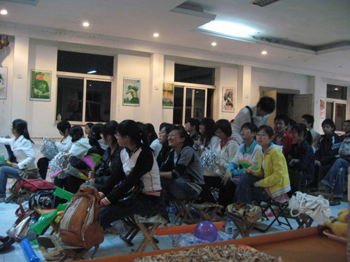 晚上,“迎奥运庆五一、军民共建大联欢”晚会在团岛官兵培训基地举行。同学们和部队官兵表演的歌舞、啦啦操节目博得掌声阵阵、喝采声声,学生官兵搭档的“三足运气球”游戏更是妙趣横生,一首全场激昂合唱的《歌唱祖国》把晚会气氛推向高潮。