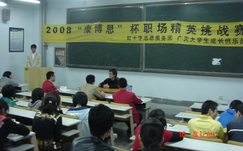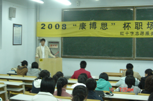 4月18日晚,红十字志愿服务团与广天咨询公司共同组织的“康博思”杯职场精英挑战赛在102阶顺利举行。来自广天咨询公司的孙汉付经理、马少坤经理和来自中外运-欧西来斯国际快递公司人力资源部的主管杨永法先生作为本次比赛的主考官。比赛中,我们模拟了真实的面试现场,参加比赛的同学们一一上台面试。