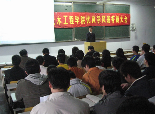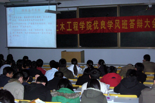 4月9日下午,土木工程学院2007~2008学年第1学期优良学风班答辩大会在1号教学楼200阶举行,为期一个月的优良学风班评选工作也就此接近尾声。