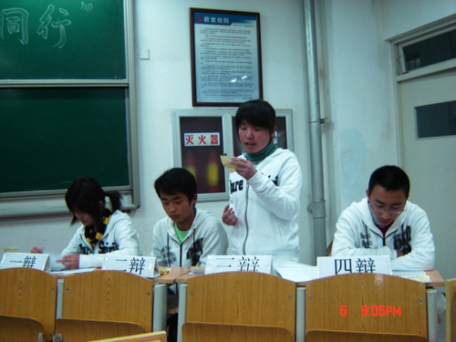 4月6日自动化工程学院第三届“我与学风同行”辩论赛半决赛在2教201教室展开07级3、4班与7、8班就“读大学长进最大的应该是知识还是人格”展开激烈的角逐。