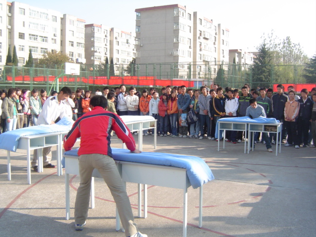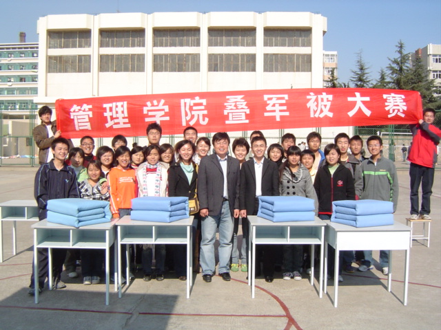 为培养同学们良好的生活习惯和严谨的生活作风,提升整体内务水平,为“迎评创优”作准备,11月10日,管理学院在北院篮球场举办了叠军被大赛。管理学院团总支书记于利俊、06级辅导员张忠臣老师、07级辅导员曲燕老师莅临比赛现场。