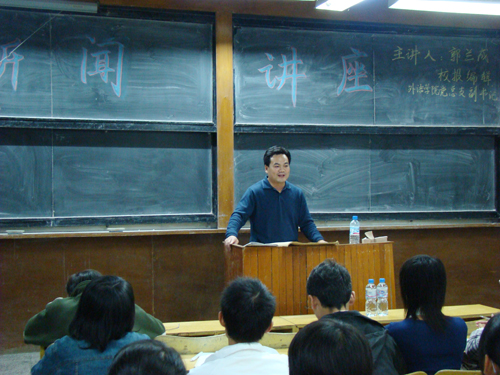 郭兰成老师首先根据自身担任校报编辑的切身经验和体会,从新闻的定义、结构及写作方法等多个角度进行了细致讲解,重点讲述了新闻标题的写作方法及其重要性。讲到标题种类时,郭老师针对各种标题示例与现场同学互动交流,同学们踊跃发言、各抒己见,在轻松愉快的氛围中学会了标题的拟定技巧。最后,郭老师特别强调了作新闻记者应有的责任感和求实精神,鼓励广大新闻记者勤写勤练,坚持到底。
