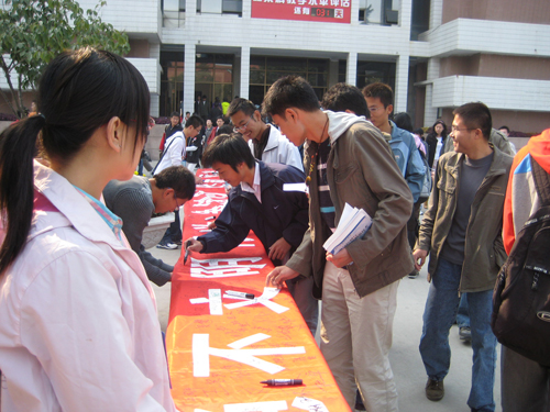 在签名活动中,同学们在“拒绝不文明行为,争创时代新风尚”的条幅上郑重签名,表达了自己今后养成文明习惯的决心。根据问卷调查的结果,机械学院发起了拒绝不文明行为的倡议,倡议全校学生携起手来与不文明现象作斗争,共建和谐文明的校园环境。