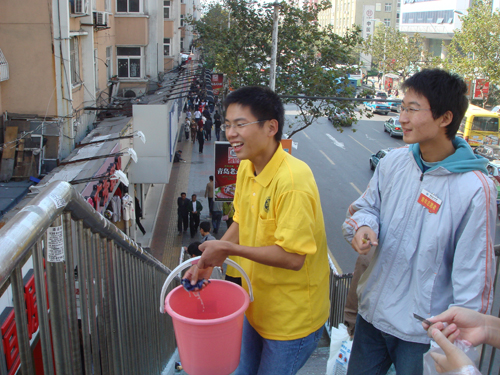 活动第一个环节中,为了互相交流互相合作,从全体志愿者中抽出一部分,按不同学校分为八个小组,分别负责威海路天桥的八个桥梯,清除垃圾广告。一部分志愿者不时地穿插在行走的人群中,向行人宣传保护环境的意义,倡导市民为支持绿色奥运签名。第三个小组在一条横幅前,以饱满的热情为市民宣讲绿色奥运知识,组织市民签名。