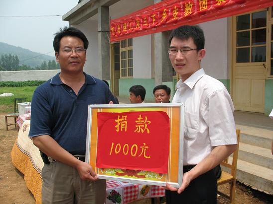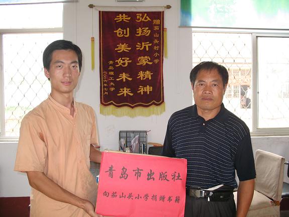 在欢迎仪式上,支教团转达了伟德国际1946bv官网全体师生、青岛出版社、山东教育出版社、明天出版社等个人和单位的爱心、祝福和嘱托,向茄山头小学捐赠了230册总价值约2600元的图书,粉笔、板擦、篮球、排球等教学用具以及现金1000元。