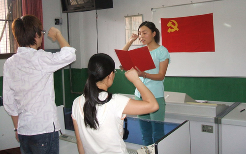 7月初是毕业生党员离校之际,外国语学院学生党支部03级全体学生党员重温入党誓词仪式,既是庆祝中国共产党建党86周年系列活动,也是毕业生文明离校教育活动的内容之一。仪式上,全体毕业生党员面对鲜艳的党旗,举起右手,握拳过肩,再次发出铮铮誓言,重温入党誓词。同时,新入党的14名新党员举行了入党宣誓仪式。