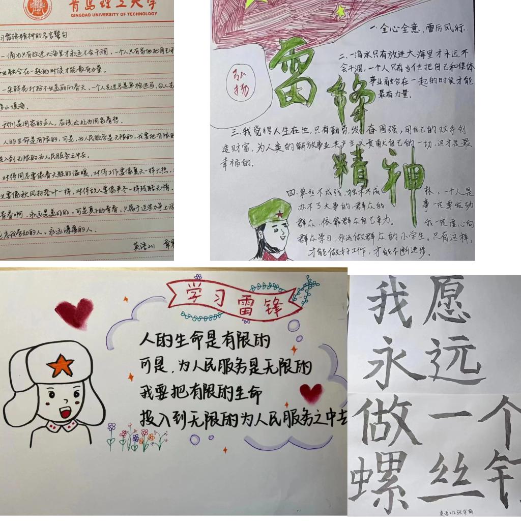 共学“雷锋语录”,传承红色经典。2月27日-3月3日,学院引导学生结合专业特色,发挥设计才能和创意设想,以创作“雷锋经典语录”原创插画的形式,使雷锋精神得到完美展现,昔日雷锋同志艰苦奋斗、奉献自我的事迹跃然纸上,令人感动、钦佩,精美的插画背后是同学们对雷锋同志深深的缅怀与敬仰。组织经典诵读,让同学们在重温红色经典中,争做先进文化的传播者、雷锋精神的倡导者,共同营造一个传递友爱、守望相助的良好社会风尚。组织各团支部以团小组为单位开展金句摘抄、小组交流会,集中学习雷锋同志的先进事迹,让雷锋精神在青年群体中得到传承与弘扬。