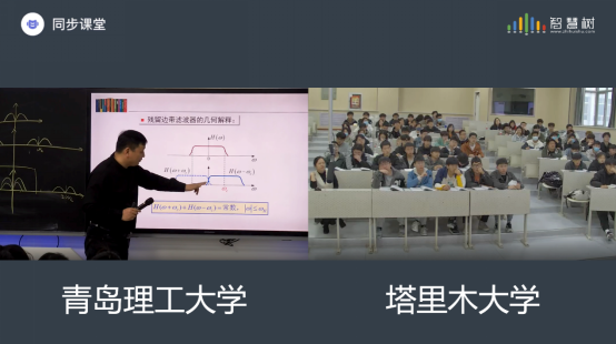 王绪虎以“学练结合”的授课模式,为两校学生呈现了一堂精彩的同步课堂。通过课堂提问,课堂练习,习题分析等方式,以模拟通信技术历史发展为主线,带领同学们深入浅出地学习了调幅(AM)、双边带调制(DSB)、单边带调制(SSB)、残留边带调制(VSB)等内容。