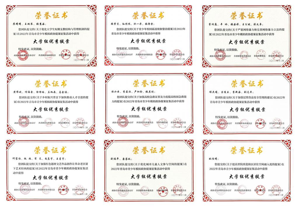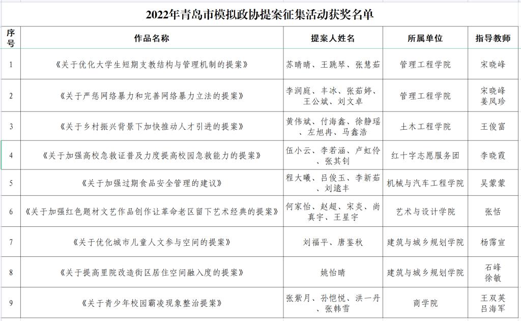 近日,由青岛市政协办公厅、青岛团市委、青岛市教育局和青岛市学联联合举办的青岛市青少年模拟政协提案征集活动落下帷幕,伟德官网9件作品荣获“大学组最佳提案”,11名老师获评“优秀指导教师”,获奖案例数量在驻青高校中名列前茅。