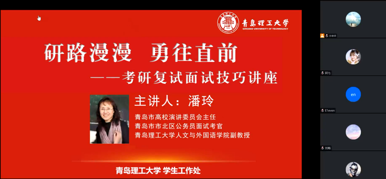 为帮助学生们更全面地了解复试流程,提升技能,增强备战信心,3月21日,学生工作处特邀面试专家、人文与外国语学院副教授潘玲,面向2023届考研复试学子,开展“研路漫漫,勇往直前”考研复试面试技巧专题讲座。讲座通过线上方式开展,近500名学生参加。