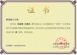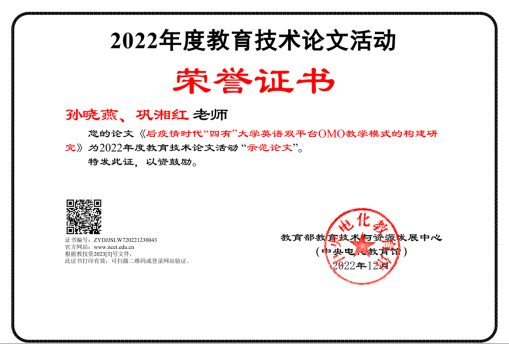 其中,孙晓燕、巩湘红撰写的《后疫情时代“四有”大学英语双平台OMO教学模式的构建研究》被中央电化教育馆评为2022年度教育技术论文活动“示范论文”。
