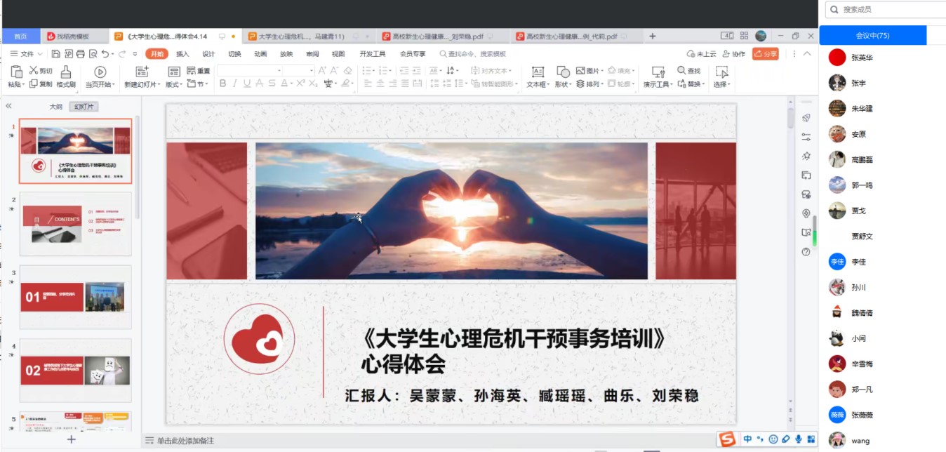 花会娟围绕“高校辅导员工作室建设思考”这一主题,结合哈尔滨师范大学刘国权“新时代 新青年 新担当”辅导员名师工作室、 西南石油大学伍晓芸“E路同行”辅导员工作室、郑州大学胡波“青春导航”辅导员工作室建设经验,从高校辅导员工作室建设概况、现实瓶颈、建设方略、实际案例等方面分享了辅导员工作室建设学习体会。刘荣稳结合培训内容与工作经历,重点介绍了辅导员视角下大学生心理健康工作的思考与实践,包括心理育人政策解读、大学生心理健康教育知识要点、心理危机案例、谈心谈话技巧、辅导员心理危机管理干预技能等内容,分享实用方法,提出可行建议。