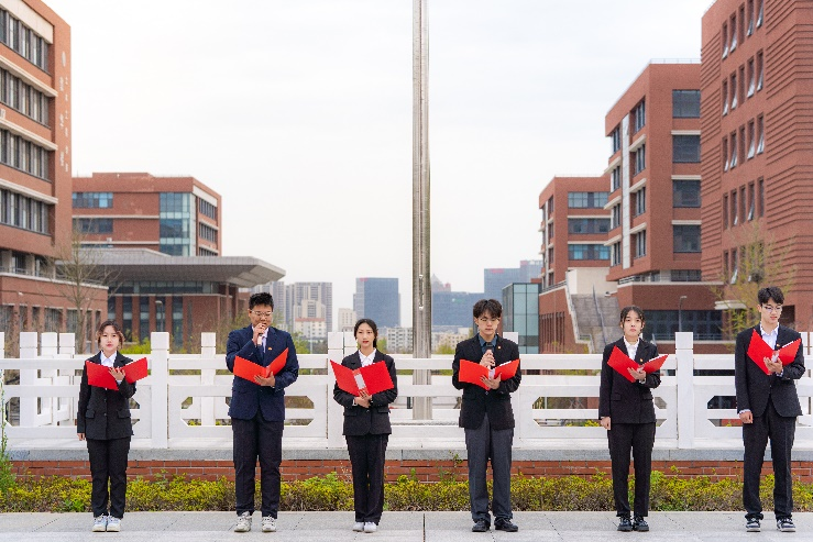 五星红旗迎风飘扬,莘莘学子一心向党。迎着春日的朝阳,英姿飒爽的国旗护卫队护送鲜艳的五星红旗进场,在庄严的中华人民共和国国歌声中,五星红旗冉冉升起,迎风飘扬。在场的全体师生向国旗行注目礼,饱含对祖国无限的热爱和崇高的敬意。全体团员青年重温入团誓词,唤起了在场每一位团员青年青春的激情与担当。同学们纷纷表示,要时刻牢记共青团员身份,坚定信念、努力拼搏,自觉加强自身组织性、纪律性,进一步增强青年学子的向心力和战斗力。