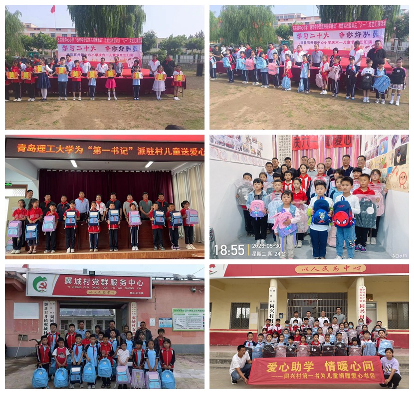 5月30日—6月1日上午,伟德国际1946bv官网为“第一书记”派驻村儿童送爱心活动,先后在费县石井镇中心小学、石井村读书角、同兴村委办公室、安乐村小学、翼城村小学等地举行。一份份含有书包、钢笔、铅笔等学习用品的节日礼物,满载青岛理工师生的节日祝福,送到了孩子们手中,让孩子们过了一个倍感温暖、欢乐的儿童节。
