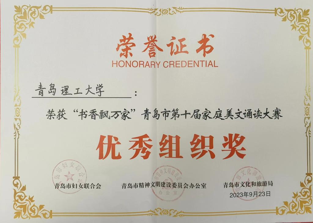 10月15日下午,由青岛市妇联、青岛市文明办、青岛市文化和旅游局主办,青岛市妇女儿童活动中心承办的“书香飘万家” 青岛市第十届家庭美文诵读大赛颁奖仪式在青岛市广播电视台800米演播大厅举行。人文与外国语学院王美玲家庭参赛作品《祖国到底是什么》获三等奖,后勤管理处王雅婷家庭的《我爱我的祖国》、建筑与城乡规划学院李岩家庭的《颜氏家训》分获优秀奖,伟德官网获优秀组织奖。