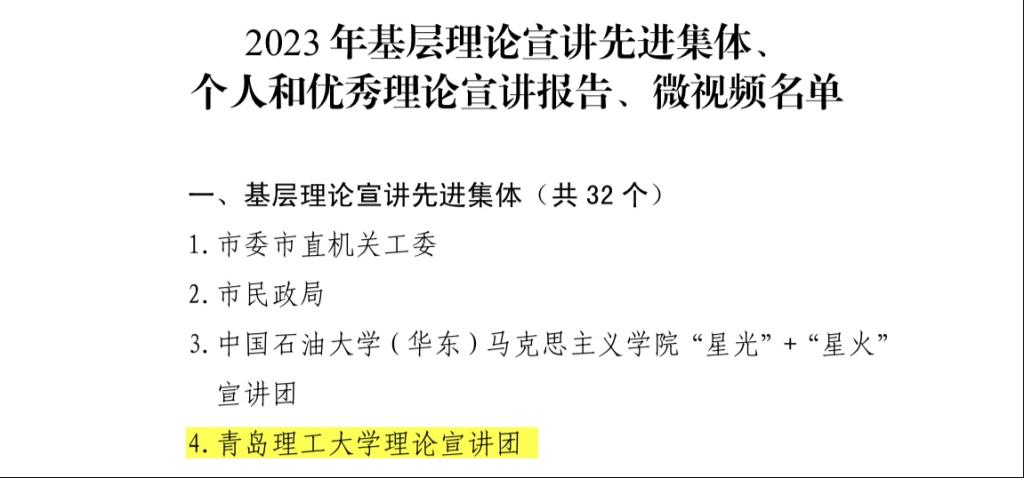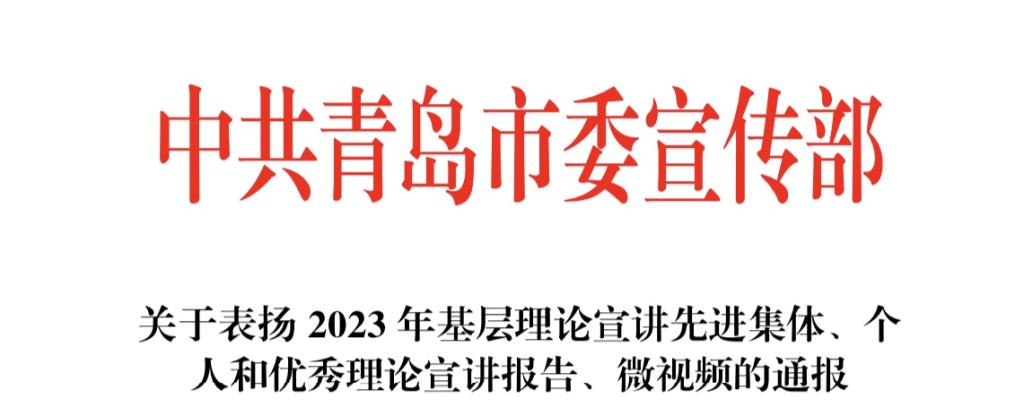 近日,中共青岛市委宣传部公布了2023年基层理论宣讲先进集体、个人和优秀理论宣讲报告、微视频名单。伟德国际1946bv官网理论宣讲团被授予2023年青岛市基层理论宣讲先进集体称号,是本次全市两个受表彰的高校先进集体之一。
