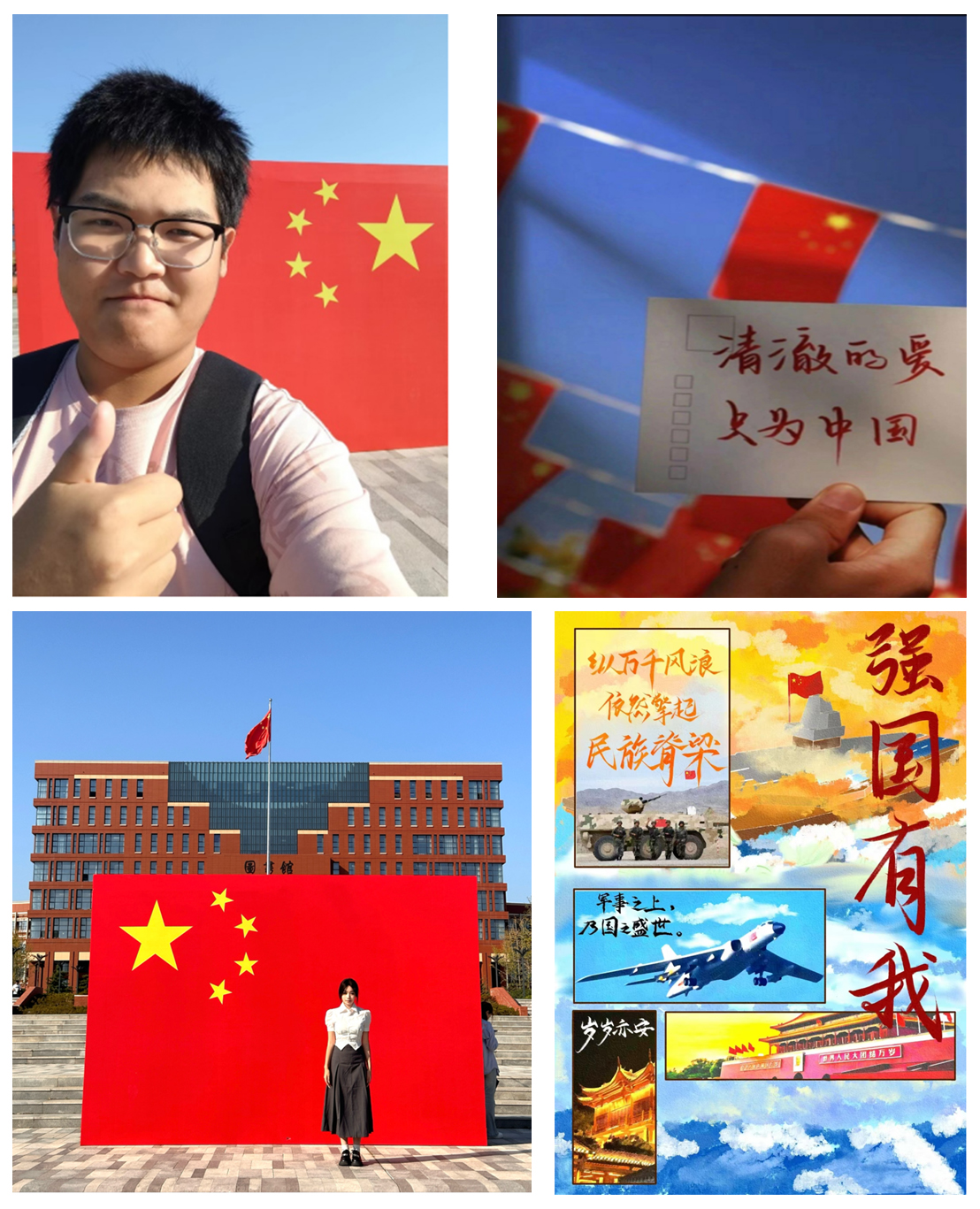 为鼓励学生以更加多元的方式表达对先烈的敬意和对祖国的热爱,学院自9月26日发起了“英雄我想对你说”和“我和国旗合个影”创意表达活动。同学们通过撰写心得感悟、留下与国旗合影照片或海报等形式,向祖国的生日送上自己的祝福。“爱国就要晒出来!表白祖国、与国旗合影,我要让更多的人看到我对祖国的爱,也记录下我在大学与祖国共奋进的瞬间!”力学232班张煜敏开心地说道。